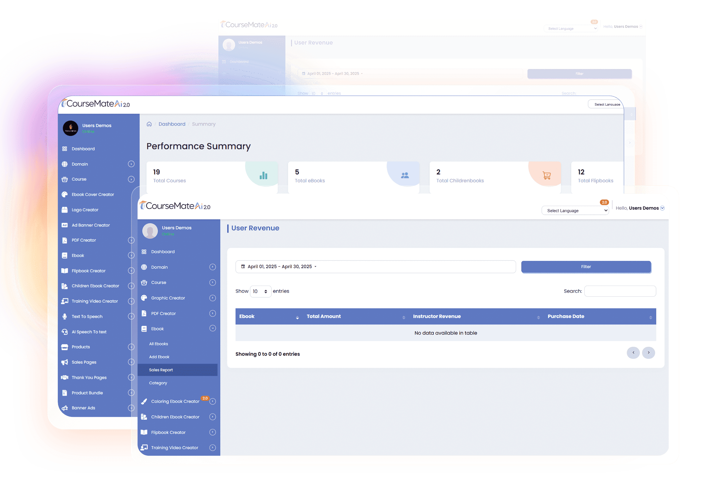 Inside the dashboard, head over to the eBook category, and you can see your sales and revenue reports – User revenue and instructor revenue from the eBooks sold through the site.